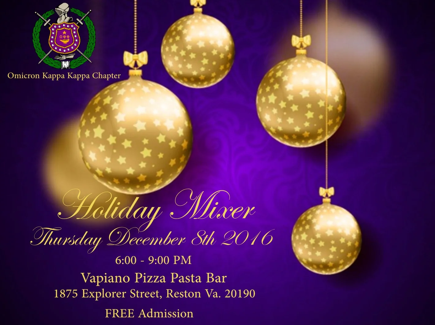 Join us for our 2016 Holiday Mixer, Thursday December 8th, 2016. 6:00 - 9:00 pm at Vapiano Pizza Pasta Bar, 1875 Explorer Street, Reston Va 20190. FREE Admission